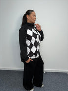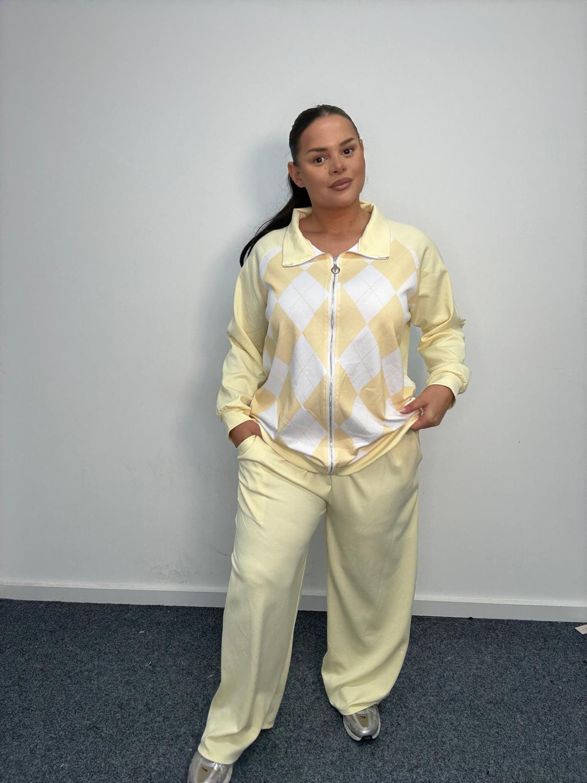 Add a trend-led classic to your curve collection with this plus size argyle co-ord set. Combining comfort with timeless pattern detailing, this two-piece set is ideal for UK boutiques looking for elevated casualwear in extended sizing. The zip-up jacket features a high neckline and statement argyle diamond front panel, balanced with contrast black sleeves for a flattering silhouette. The coordinating wide leg trousers offer a relaxed fit, providing comfort and movement while maintaining a polished finish. Crafted from soft stretch fabric, this co-ord is perfect for loungewear edits, travel styling, casual daywear and transitional seasonal collections. The colour palette makes it easy to merchandise and style in-store. A strong wholesale option for curve retailers seeking comfortable yet fashion-forward sets.